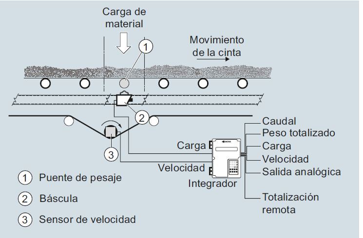 El material transportado por la cinta pasa por la báscula, ejerciendo una fuerza proporcional a la carga sobre las células a través de la estación de rodillos suspendida. Los medidores de tensión incorporados miden la fuerza aplicada en cada célula. Los extensímetros excitados por la tensión procedente del integrador generan una señal eléctrica proporcional a la carga de la cinta y la transmiten al integrador.